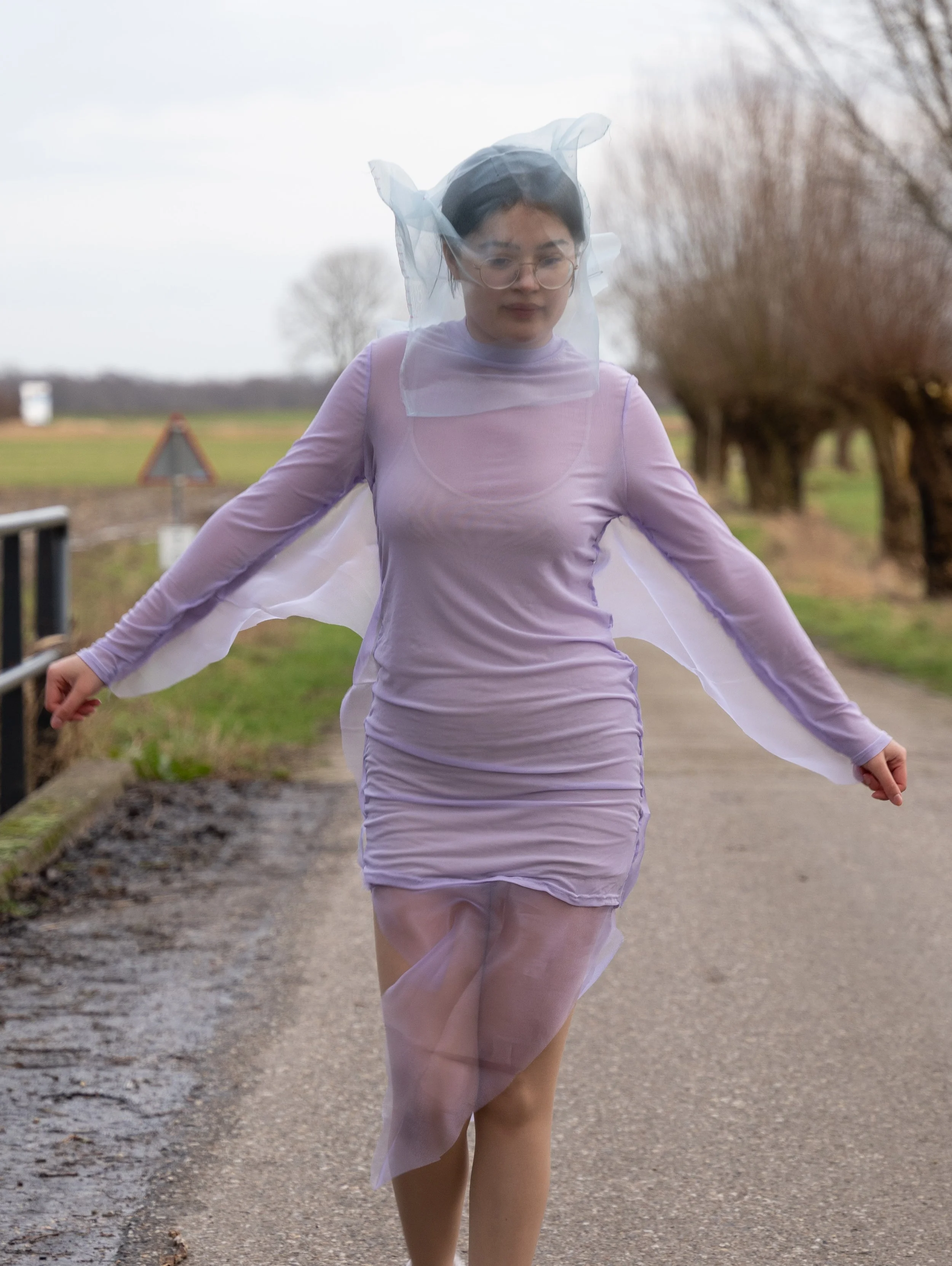 Strakke kleding blokkeert de zon minder goed dan losse kleding; daarom hebben we besloten een nauwsluitende pasvorm als basis te gebruiken. Katoen laat het meeste UV-licht door; echter is de weefwijze belangrijker dan het materiaal. Omdat katoen minder variatie in weefwijze biedt, kozen we voor zeer los geweven polyester. En tot slot de kleur: omdat lichtere kleuren zoals wit minder goed tegen UV beschermen, hebben we voor pastelpaars gekozen.